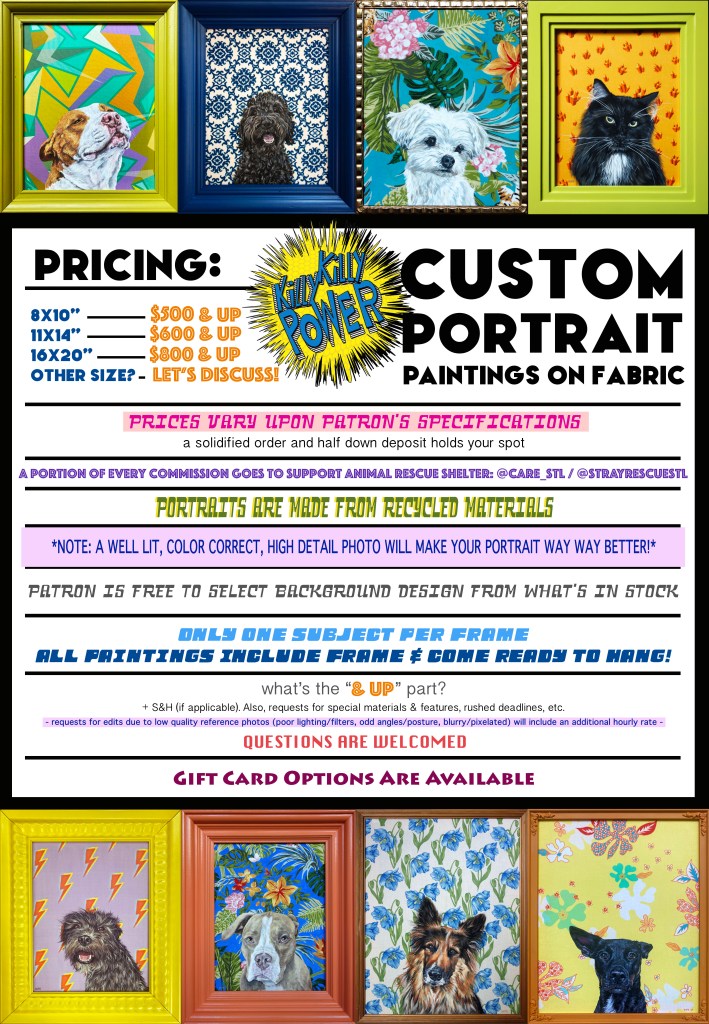 Custom designed fabrics (created special for your portrait) start at an additional $150 for artwork & production on standard sizes. Requests for multiple iterations on design work will have additional fees determined by the specifications of each project.